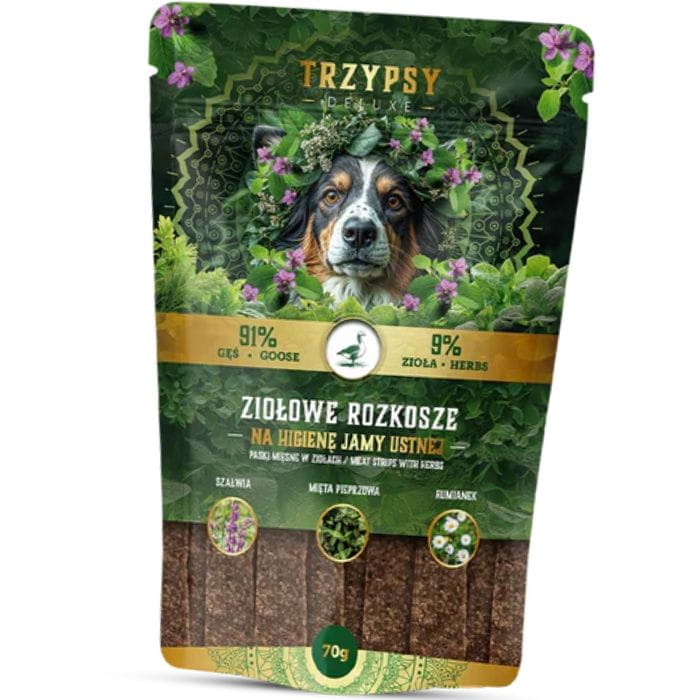 Paski z mięsa gęsi w ziołach zostały stworzone z myślą o higienie jamy ustnej Twojego pupila. Szałwia oczyszcza jamę ustną, mięta zwalcza nieprzyjemne zapachy, a rumianek łagodzi podrażnienia dziąseł.
