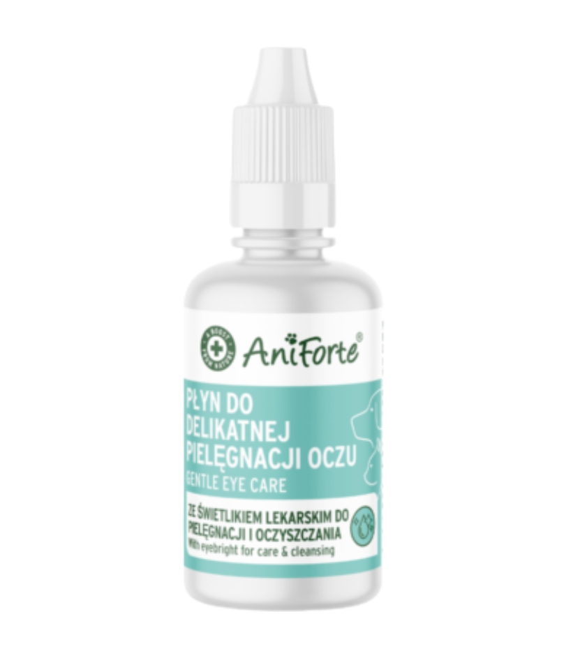 AniForte Delikatny płyn do pielęgnacji oczu to wyjątkowo łagodny preparat do codziennego oczyszczania i pielęgnacji wrażliwej okolicy oczu u psa, kota oraz małych zwierząt. Specjalna formuła ze świetlikiem lekarskim pomaga usuwać brud, strupy i wydzielinę z powiek oraz ich brzegów, a jednocześnie pozostaje delikatna dla skóry wokół oczu. To wygodne wsparcie codziennej higieny, szczególnie u zwierząt ze skłonnością do zabrudzeń i przebarwień od łez.