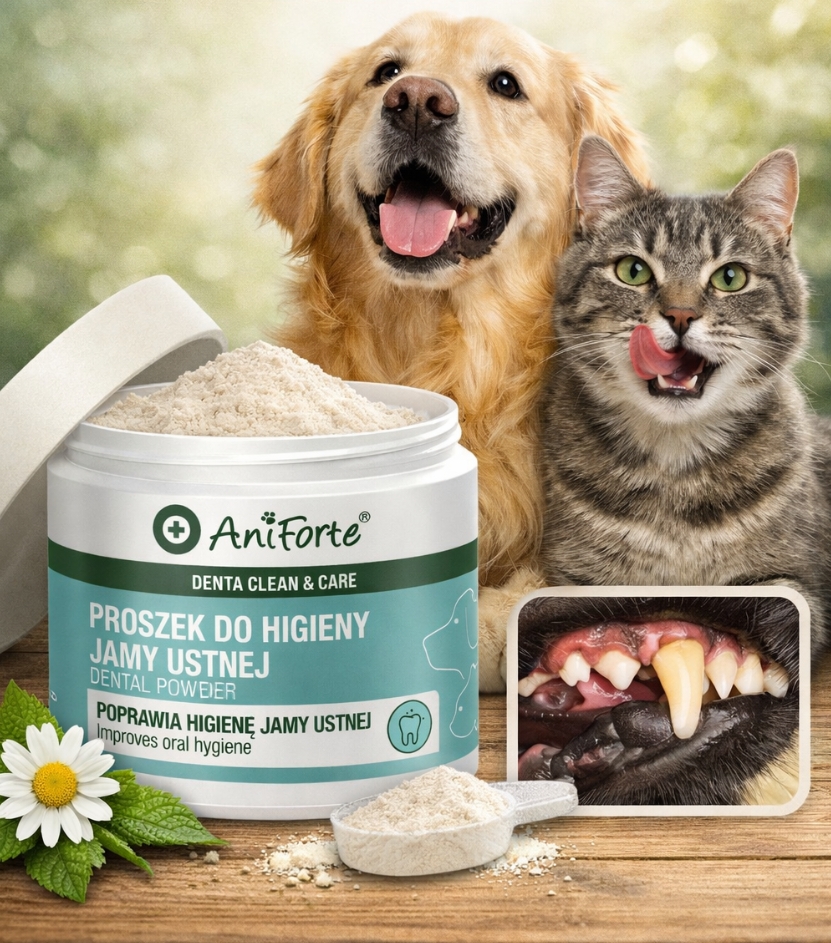 AniForte Proszek dentystyczny dla psa i kota to naturalny preparat stworzony z myślą o codziennej higienie zębów i dziąseł. Dzięki starannie dobranym składnikom wspiera utrzymanie prawidłowego pH śliny, pomaga ograniczać odkładanie się płytki nazębnej i kamienia oraz wspiera świeży oddech. To wygodny sposób, by każdego dnia zadbać o zdrowie jamy ustnej pupila bez stresu i bez trudnej aplikacji.