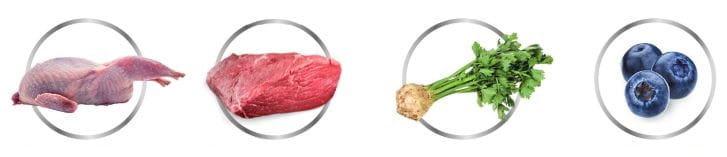 34% przepiórka (23% mięso, 8% serca, 3% wątroba), 34% wołowina (25% mięso, 6% serca, 3% wątroba), 26% bulion wołowy, 3% seler (nać), 2% jagoda, 1% minerały.