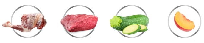 34% kozina (23% mięso, 8% serca, 3% wątroba), 34% cielęcina (25% mięso, 6% serca, 3% wątroba), 26% bulion cielęcy, 3% cukinia, 2% morela, 1% minerały.