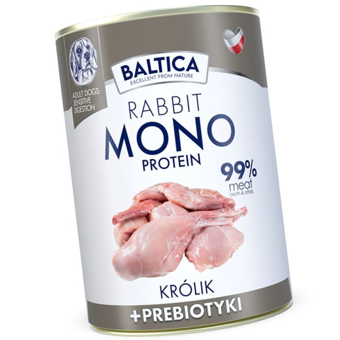 Skład: 99% królika (w tym: 71% mięsa z królika i podrobów (5% serca, 5% wątroba, 5% płuca, 5% nerki), 28% bulionu z królika), 1% minerały, mannanooligosacharydy (MOS), fruktooligosacharydy (FOS).