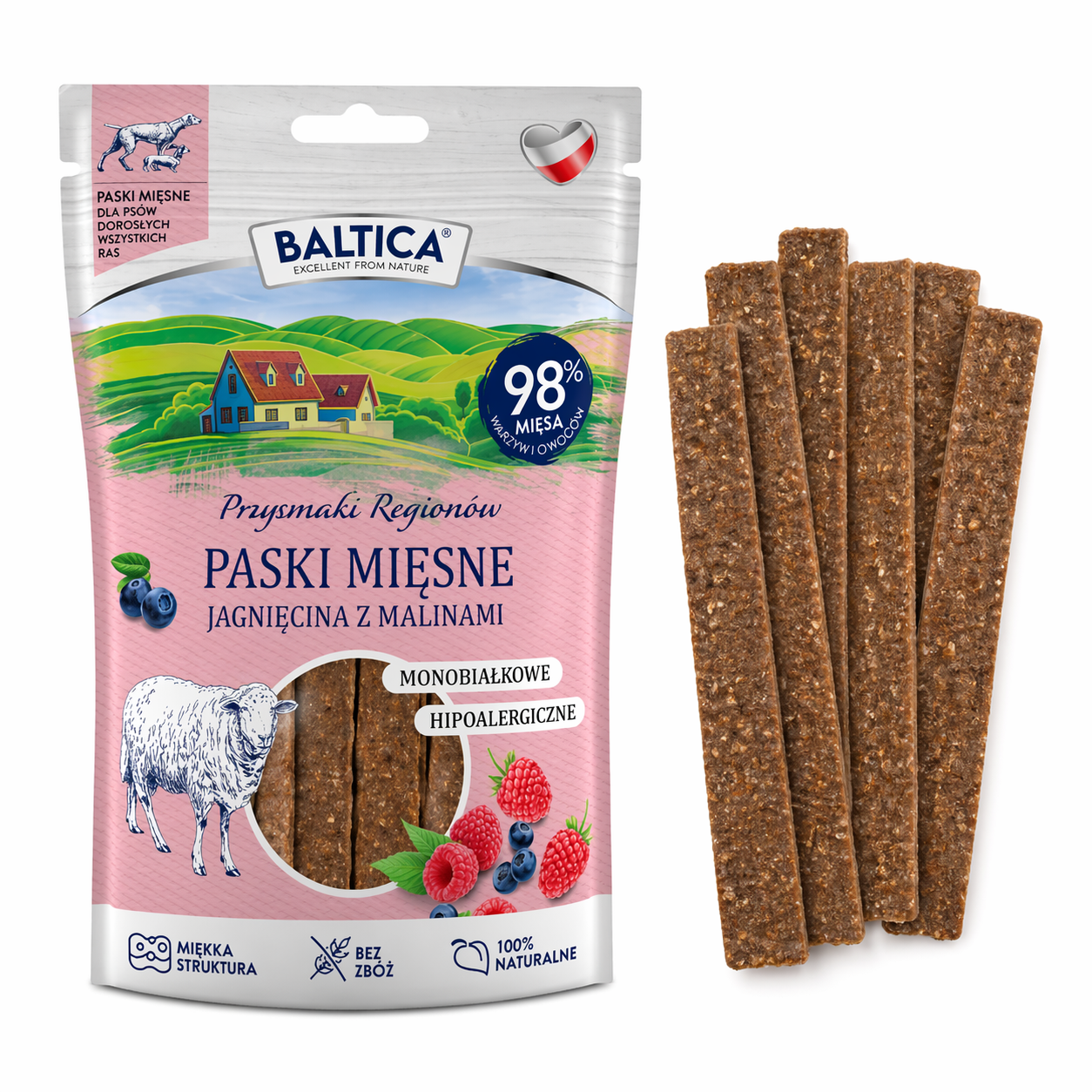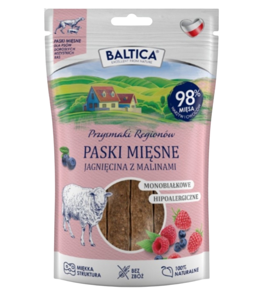 Baltica Mięsne paski jagnięcina z malinami przysmak dla psa 90g