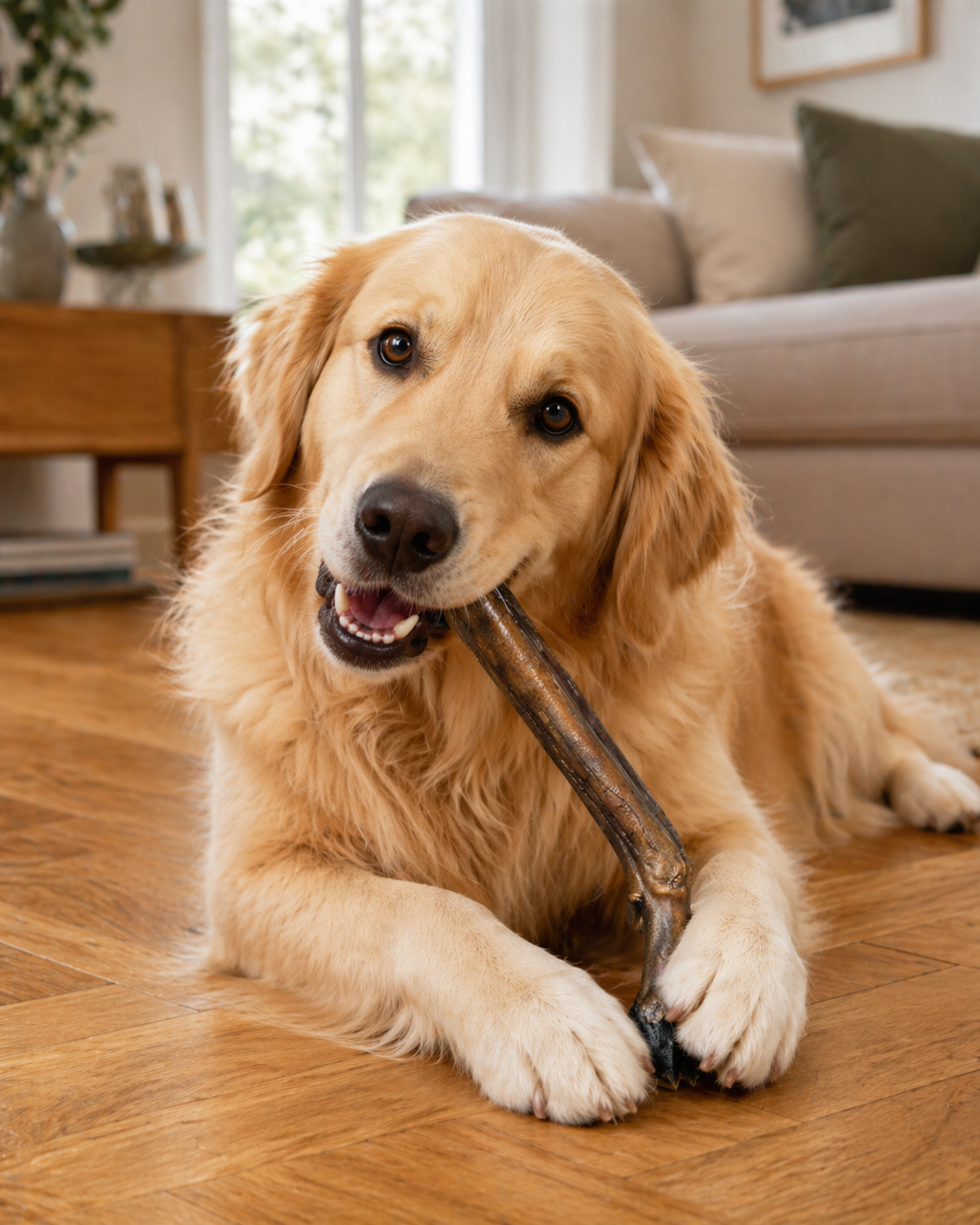 Podczas gryzienia racica pomaga mechanicznie oczyszczać zęby i wspierać dziąsła, a sam proces żucia daje psu wyciszenie i zajęcie na dłużej. Wysoka zawartość białka, chrząstki i kolagenu sprawia, że przysmak wspiera także układ mięśniowo stawowy oraz ogólną kondycję psa. To gryzak, który łączy przyjemność z gryzienia z realnymi korzyściami w codziennej diecie.