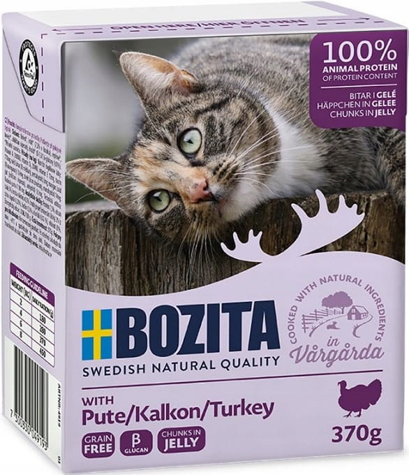 Bozita Feline Turkey o zwiększonej zawartości indyka to smaczna mokra karma dla kotów oparta na surowcach najwyższej jakości. Duża zawartość mięsa i mała ilość tłuszczu oraz naturalnie zbilansowana zawartość witamin i składników mineralnych wzmacnia układ odpornościowy Twojego kota.