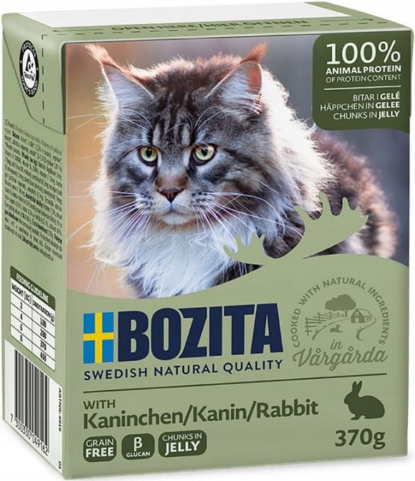 Bozita Feline królik w galaretce o zwiększonej zawartości królika to smaczna mokra karma dla kotów oparta na surowcach najwyższej jakości. Duża zawartość mięsa i mała ilość tłuszczu oraz naturalnie zbilansowana zawartość witamin i składników mineralnych wzmacnia układ odpornościowy Twojego kota.