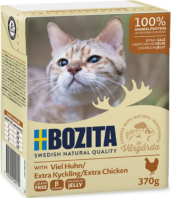 Bozita Feline Kurczak siekany w galaretce o zwiększonej zawartości kurczaka to smaczna mokra karma dla kotów oparta na surowcach najwyższej jakości. Duża zawartość mięsa i mała ilość tłuszczu oraz naturalnie zbilansowana zawartość witamin i składników mineralnych wzmacnia układ odpornościowy Twojego kota.