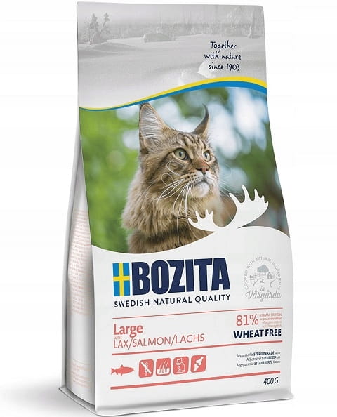 Bozita Large z łososiem, bez pszenicy to pełnoporcjowa karma dla dorosłych kotów. Jej zawartość i krokiety dostosowane szczególności dla dużych i długowłosych kotów oraz kotów które jedzą zbyt szybko.