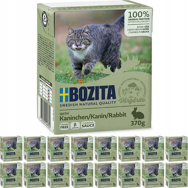 Bozita Feline Królik w sosie o zwiększonej zawartości królika to smaczna mokra karma dla kotów oparta na surowcach najwyższej jakości. Duża zawartość mięsa i mała ilość tłuszczu oraz naturalnie zbilansowana zawartość witamin i składników mineralnych wzmacnia układ odpornościowy Twojego kota.