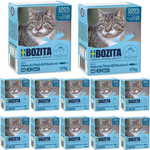 Bozita Feline Kawałki makreli w galaretce o zwiększonej zawartości makreli to smaczna mokra karma dla kotów oparta na surowcach najwyższej jakości. Duża zawartość mięsa i mała ilość tłuszczu oraz naturalnie zbilansowana zawartość witamin i składników mineralnych wzmacnia układ odpornościowy Twojego kota.