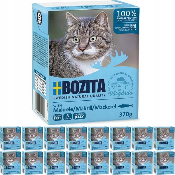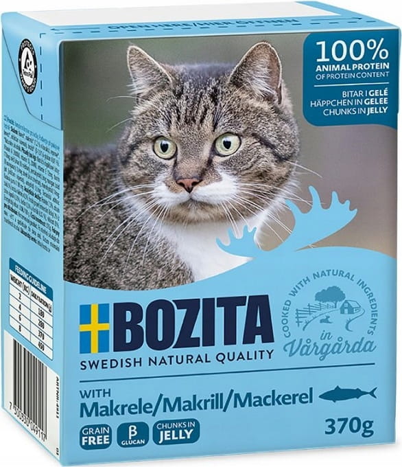 Bozita Feline Kawałki makreli w galaretce o zwiększonej zawartości makreli to smaczna mokra karma dla kotów oparta na surowcach najwyższej jakości. Duża zawartość mięsa i mała ilość tłuszczu oraz naturalnie zbilansowana zawartość witamin i składników mineralnych wzmacnia układ odpornościowy Twojego kota.