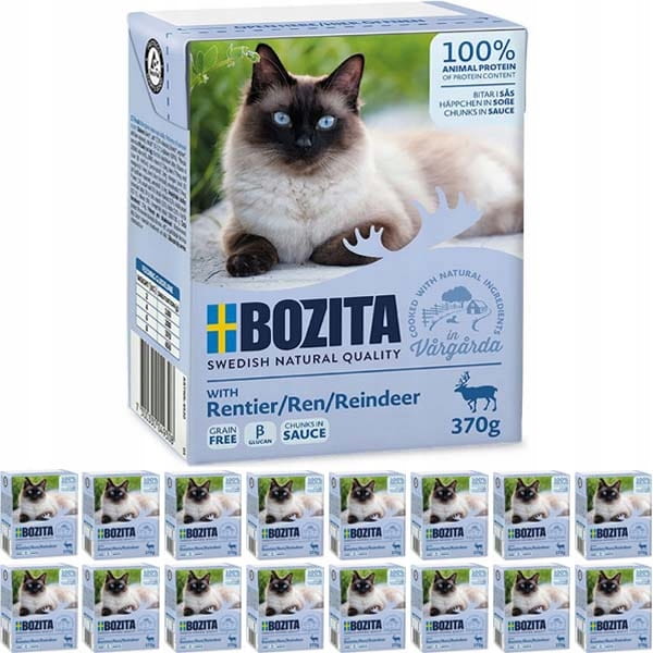 Bozita Feline z mięsem z renifera w sosie o zwiększonej zawartości renifera to smaczna mokra karma dla kotów oparta na surowcach najwyższej jakości. Duża zawartość mięsa i mała ilość tłuszczu oraz naturalnie zbilansowana zawartość witamin i składników mineralnych wzmacnia układ odpornościowy Twojego kota.