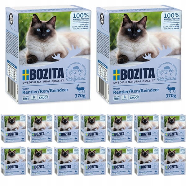 Bozita Feline z mięsem z renifera w sosie o zwiększonej zawartości renifera to smaczna mokra karma dla kotów oparta na surowcach najwyższej jakości. Duża zawartość mięsa i mała ilość tłuszczu oraz naturalnie zbilansowana zawartość witamin i składników mineralnych wzmacnia układ odpornościowy Twojego kota.