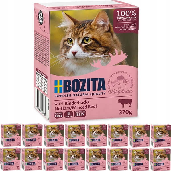 Bozita Feline mielona wołowina w galaretce o zwiększonej zawartości wołowiny to smaczna mokra karma dla kotów oparta na surowcach najwyższej jakości. Duża zawartość mięsa i mała ilość tłuszczu oraz naturalnie zbilansowana zawartość witamin i składników mineralnych wzmacnia układ odpornościowy Twojego kota.