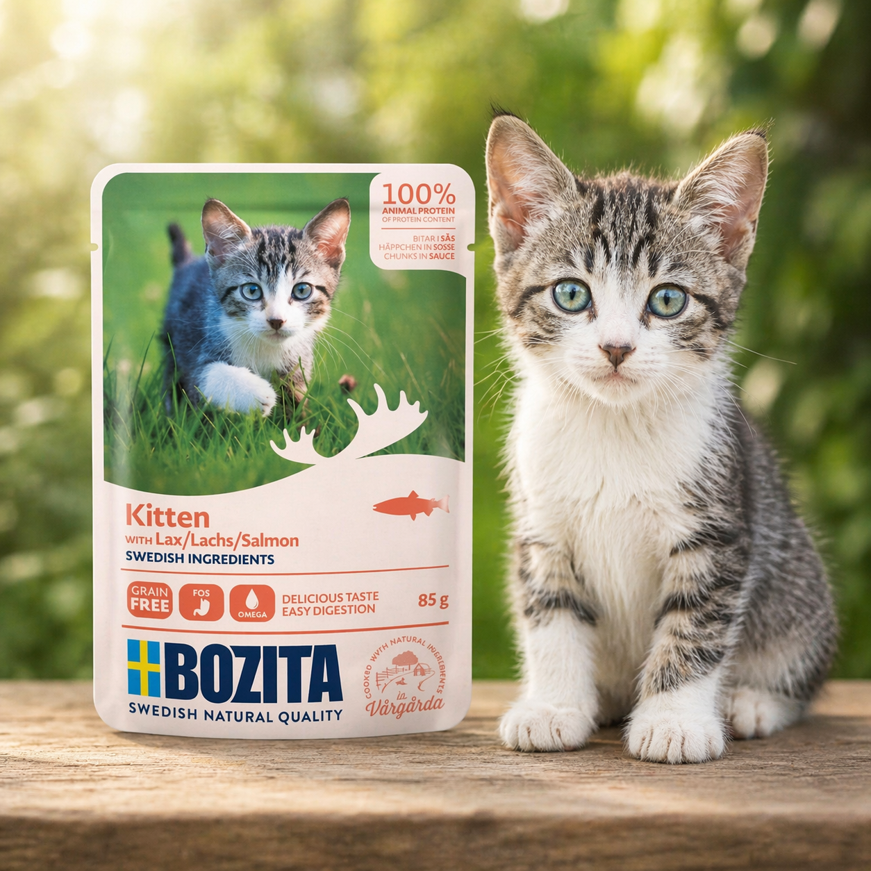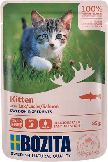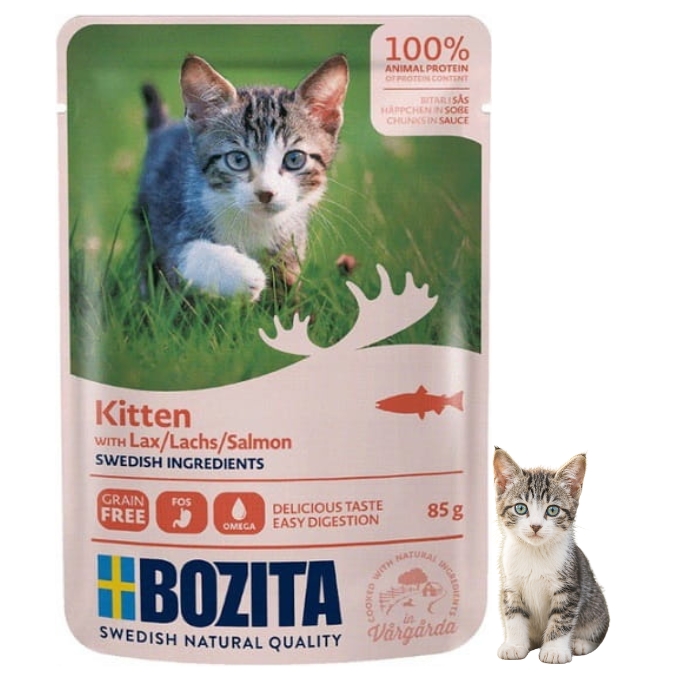 Bozita Kitten kawałki w sosie z łososiem to kompletna, bezzbożowa karma mokra stworzona z myślą o kociętach, młodych kotach oraz kotkach w ciąży i karmiących. To delikatny, pełnoporcjowy posiłek, który dostarcza wszystkich niezbędnych składników odżywczych potrzebnych w okresie intensywnego wzrostu i rozwoju. Receptura oparta na naturalnych, świeżych składnikach pochodzących ze szwedzkiej wsi i natury łączy wysoką smakowitość z troską o zdrowe jelita, rozwój mózgu i prawidłowe funkcjonowanie organizmu.