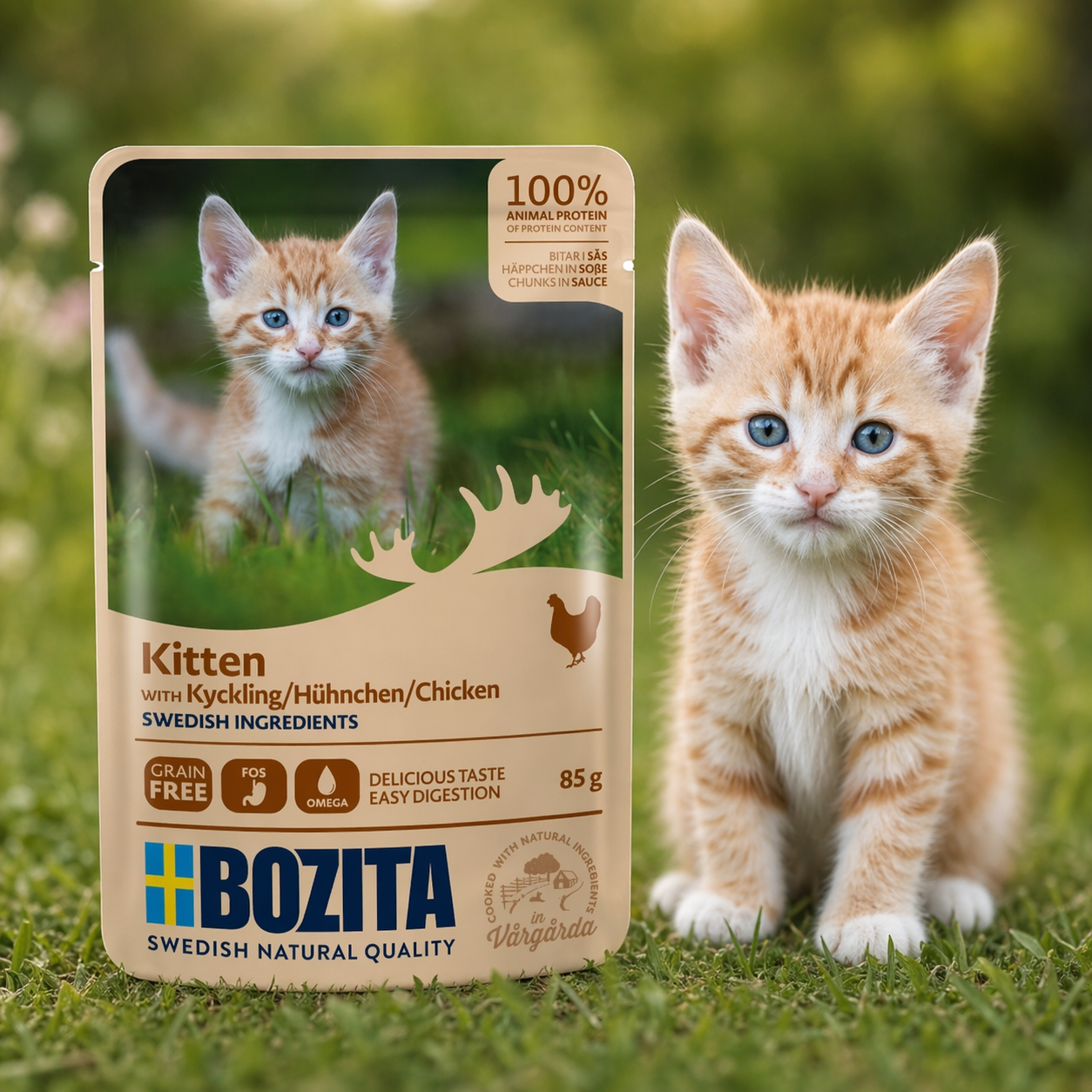 Ta kompletna, bezzbożowa karma mokra z kurczakiem została stworzona z myślą o kociętach, młodych kotach oraz kotkach w ciąży i karmiących. To delikatny, pełnoporcjowy posiłek, który dostarcza wszystkich niezbędnych składników odżywczych potrzebnych w okresie intensywnego wzrostu i rozwoju. Receptura oparta na naturalnych, świeżych składnikach pochodzących ze szwedzkiej wsi i natury łączy wysoką smakowitość z troską o zdrowe jelita, rozwój mózgu i prawidłowe funkcjonowanie organizmu.