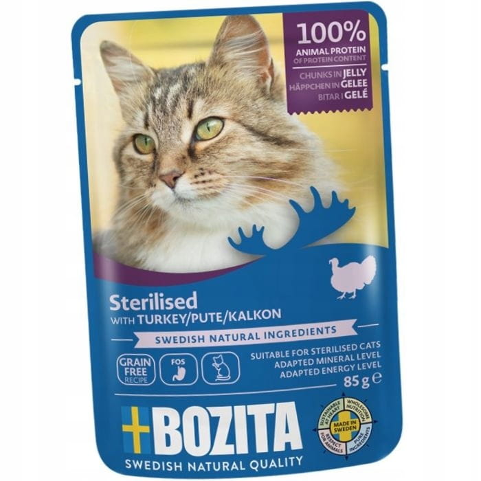 Bozita Indoor Sterilised z indykiem to kompletna, bezzbożowa karma mokra dla dorosłych kotów wysterylizowanych, stworzona z myślą o mruczkach przebywających w domu, starszych oraz tych, które mają skłonność do nadwagi. To pełnoporcjowy posiłek o dopasowanym poziomie energii i minerałów, który wspiera codzienną kondycję kota, a jednocześnie zachowuje wysoką smakowitość i dobrą strawność. Delikatne kawałki w galaretce z indykiem to smak, który koty chętnie wybierają.