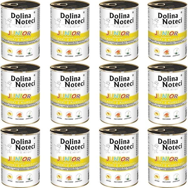 Szczenięta i młode psy, ze względu na specyficzne wymagania żywieniowe, potrzebują zwiększonej ilości składników odżywczych, mineralnych i witaminowych. Receptura pełnoporcjowych karm mokrych Dolina Noteci Premium Junior bogata w żołądki z kurczaka spełnia nowoczesne normy żywieniowe i zalecenia prawidłowego żywienia organizmów w fazie intensywnego wzrostu i rozwoju. Dzięki wykorzystaniu żołądków z kurczaka i wołowiny, karma dla juniora charakteryzuje się zawartością wysokiej jakości białka bogatego w aminokwasy egzogenne, m.in. metioninę, lizynę i fenyloalaninę. Surowce te stanowią także źródło składników mineralnych, szczególnie selenu i miedzi, odgrywających istotną rolę w stymulacji funkcji obronnych organizmu.