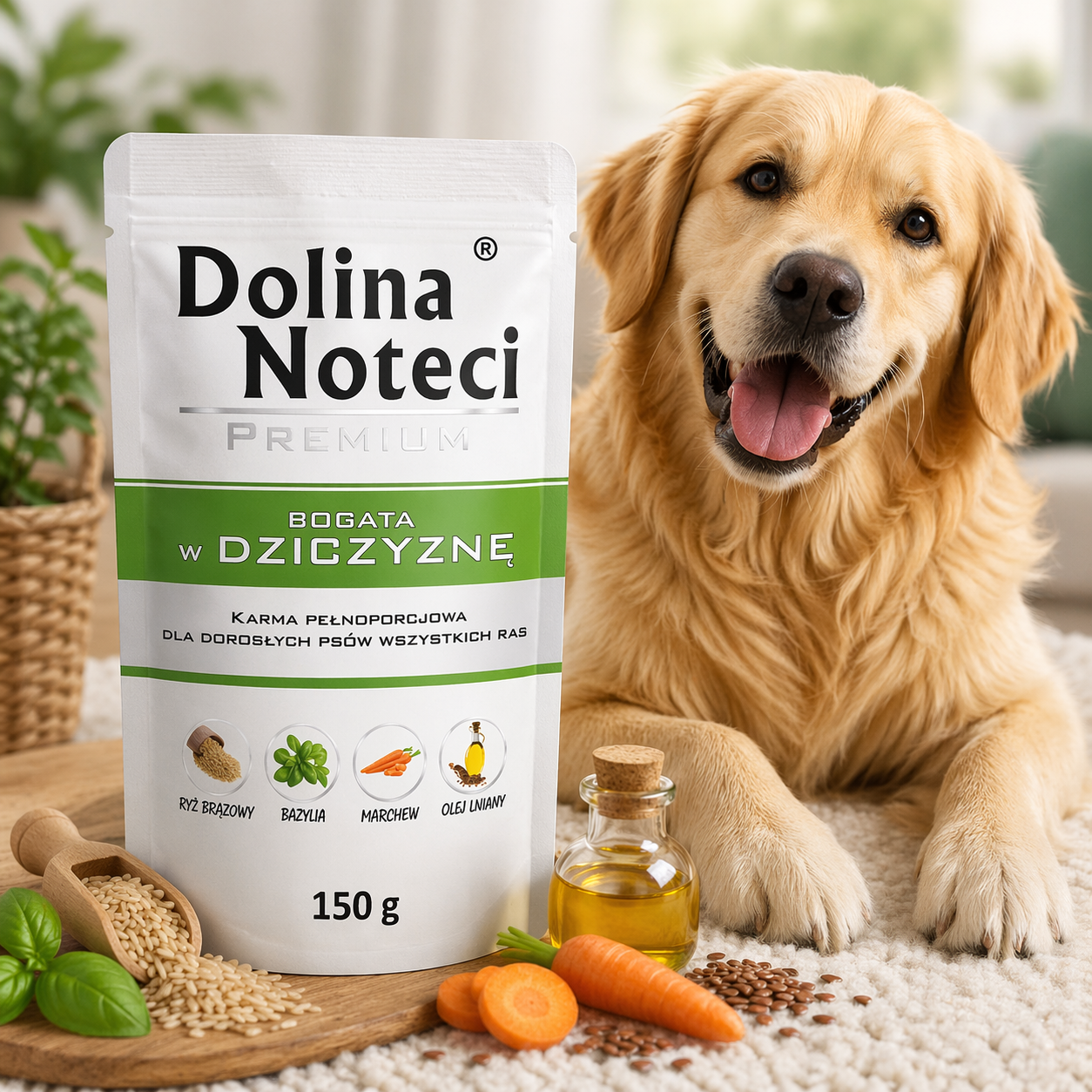 Dolina Noteci Premium bogata w dziczyznę to pełnoporcjowa mokra karma dla dorosłych psów wszystkich ras, stworzona z myślą o psach, które zasługują na wyjątkowo smakowity i wartościowy posiłek każdego dnia. Aromatyczna dziczyzna nadaje karmie wyrazisty smak, a jednocześnie dostarcza cennych składników odżywczych wspierających kondycję, odporność i zdrowy wygląd pupila. To propozycja dla opiekunów, którzy chcą podać swojemu psu coś naprawdę mięsnego, odżywczego i apetycznego.