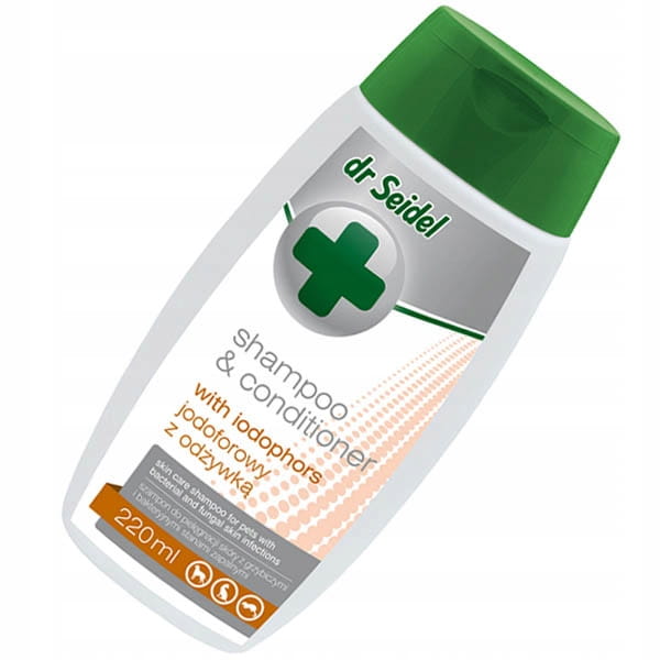 Dr Seidel Szampon jodoforowy z odżywką hamuje nadmierne przetłuszczanie skóry i eliminuje przykre zapachy. Łagodzi podrażnienia wywołane ukąszeniami pcheł. Skutecznie usuwa ze skóry wszystkie zabrudzenia i przywraca włosom naturalną miękkość i połysk. Szampon zawiera dodatkowy kompleks składników poprawiających wygląd sierści.