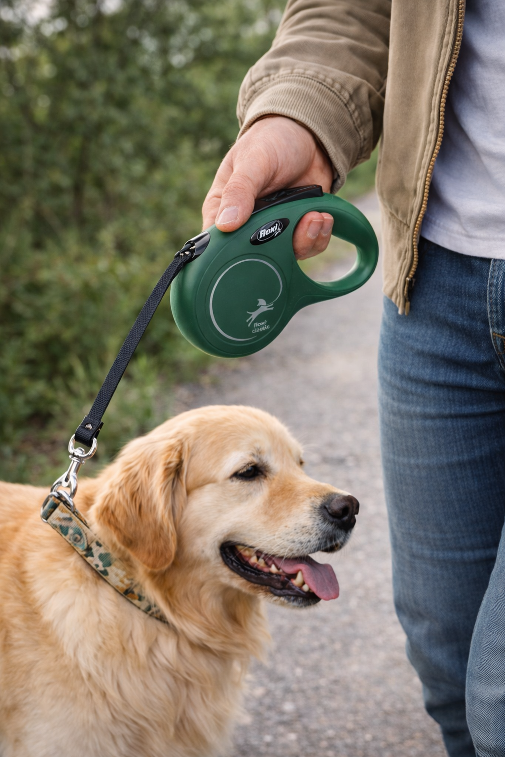 Opływowy kształt smyczy oraz wygodny uchwyt zapewniają stabilne trzymanie nawet w trudniejszych warunkach pogodowych. System zwijania i blokowania działa płynnie i pozwala łatwo kontrolować długość smyczy jedną ręką.