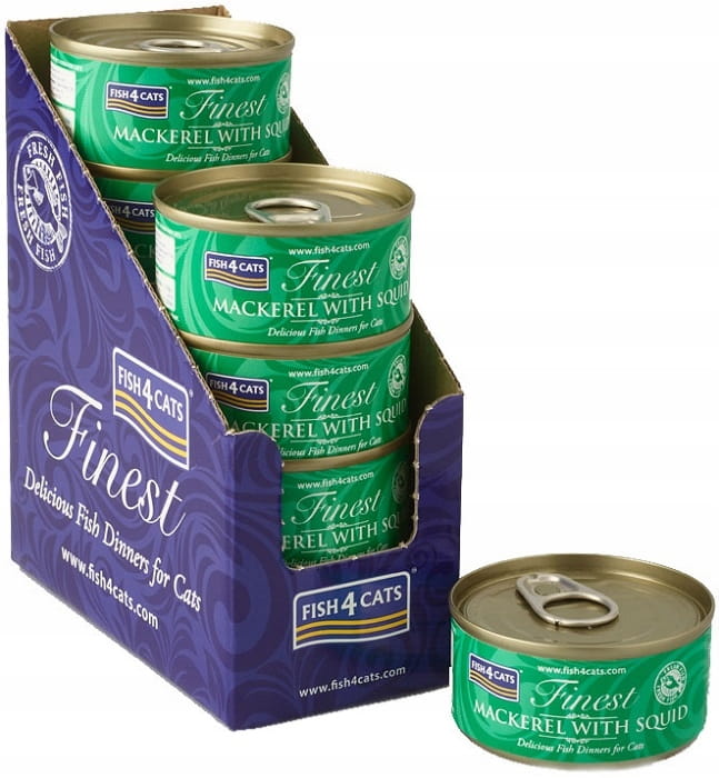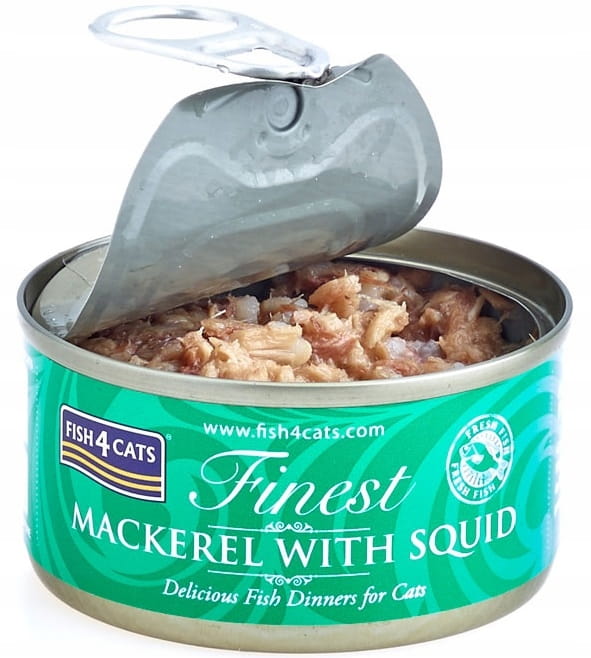 Karma mokra dla kota z ryby Fish4Cats Makrela z Kałamarnicą ma przede wszystkim bardzo wysoką zawartość ryby. Aż 65% makreli i 5% kałamarnicy.