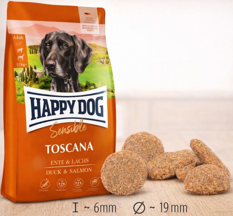 Happy Dog Sensible Toscana Mini to pełnoporcjowa sucha karma super premium dla małych psów, stworzona z myślą o codziennym żywieniu psów wrażliwych, o niższym zapotrzebowaniu energetycznym oraz szczególnych potrzebach żywieniowych. Receptura inspirowana dietą śródziemnomorską łączy kaczkę, łososia, aromatyczne zioła oraz polifenole z czerwonych winogron, tworząc wyjątkowo smakowity i dobrze przemyślany posiłek. To karma, która daje psu nie tylko sytość, ale też codzienny komfort, lekkość i wsparcie organizmu.