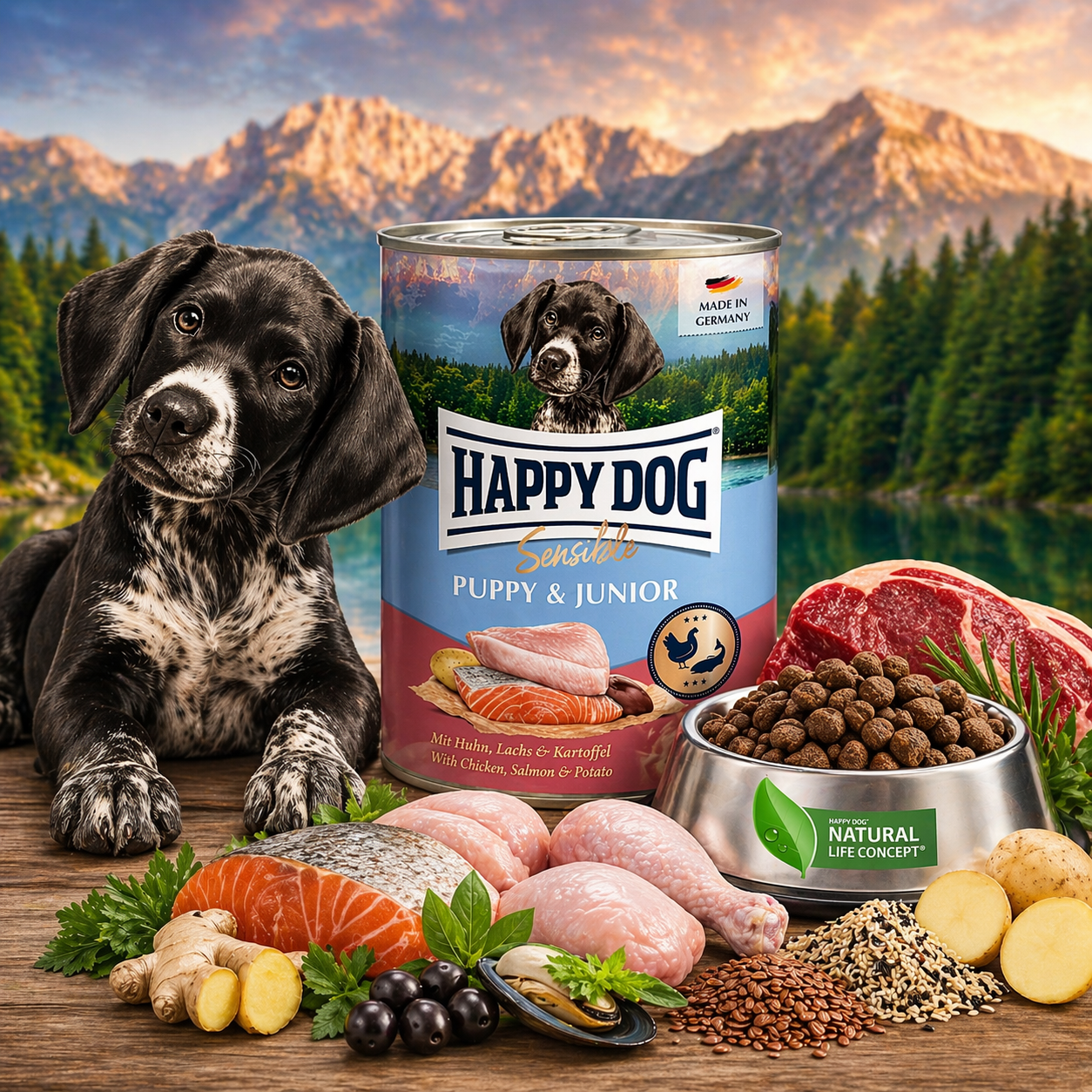 Mięso oraz produkty uboczne pochodzenia zwierzęcego (53 % - szyjka kurczaka, -mięso, -wątroba, -serce, -żołądek), łosoś (5 %), ryż*, ziemniak (2 %), tłuszcz z kurczaka, olej rzepakowy, łupiny babki jajowatej*, małża w proszku, olej z łososia, skorupka jaja w proszku, celuloza, cykoria w proszku, drożdże* (wyciąg), cząber*, liście brzozy*, rumianek*