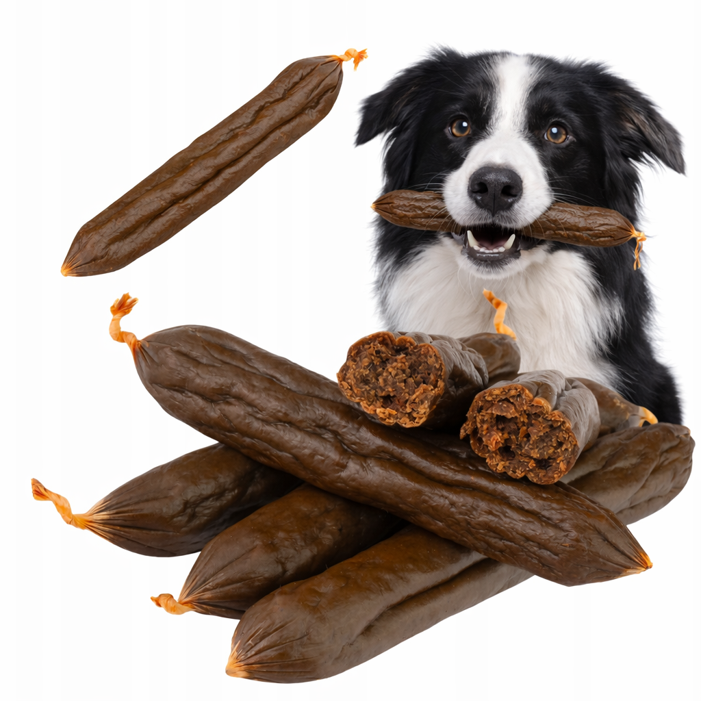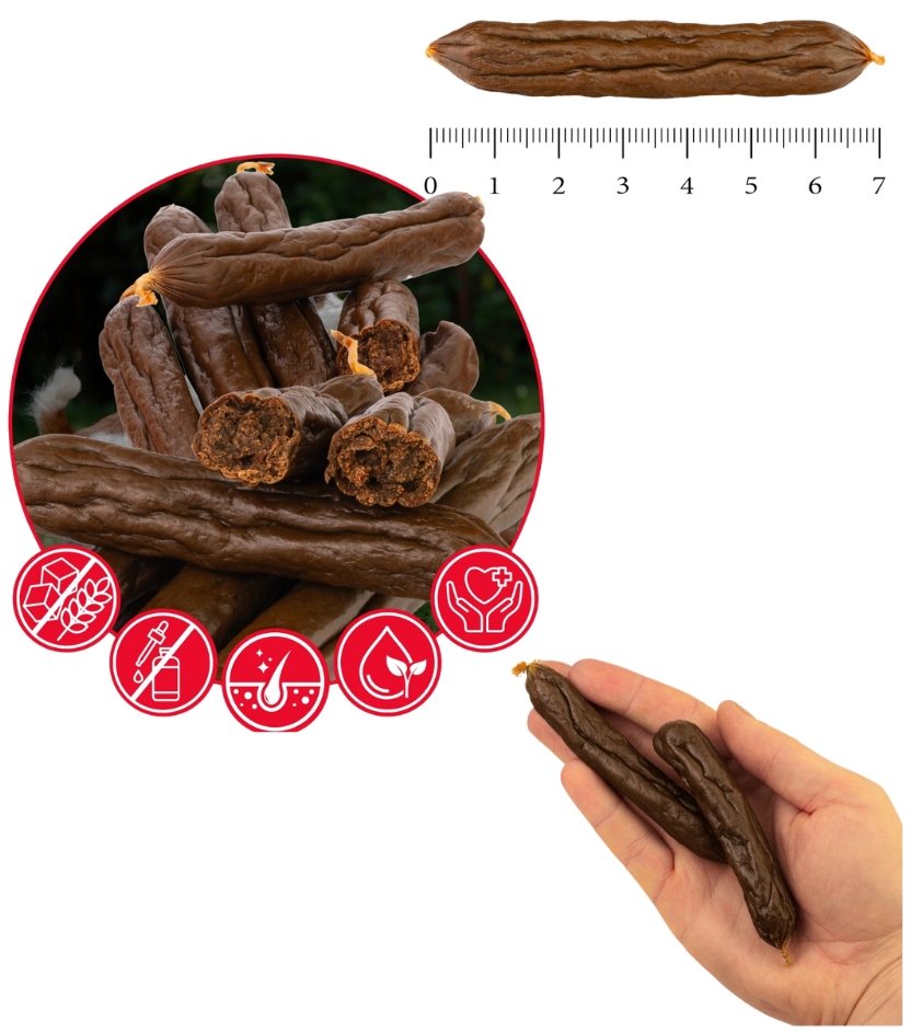 To przysmak, który łączy wysoką smakowitość z wartościowym składem. Duża zawartość mięsa i ryb dostarcza białka, a obecność oleju rybnego oraz naturalnych kwasów tłuszczowych wspiera kondycję skóry i sierści psa. Suszenie powietrzem pomaga zachować smak i wartości odżywcze, dzięki czemu kabanosy pozostają aromatyczne, apetyczne i chętnie wybierane nawet przez bardziej wymagające psy.