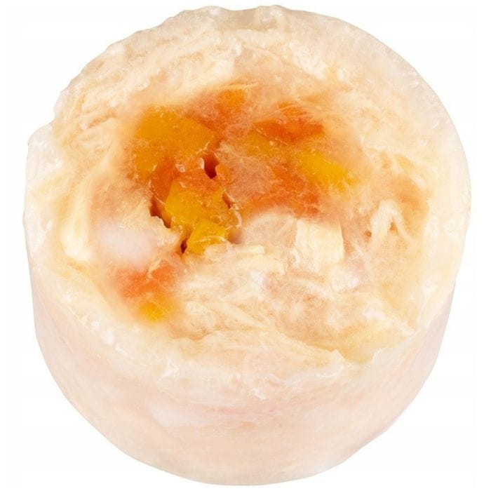 Skład: kurczak 35%, marchew 2%, dynia 2%, ryż 1,5%, żelatyna roślinna 1%