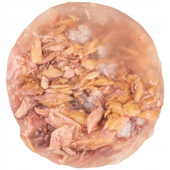 Skład: tuńczyk 51%, dorada 6%, ryż 1,5%, żelatyna roślinna 0,75%.