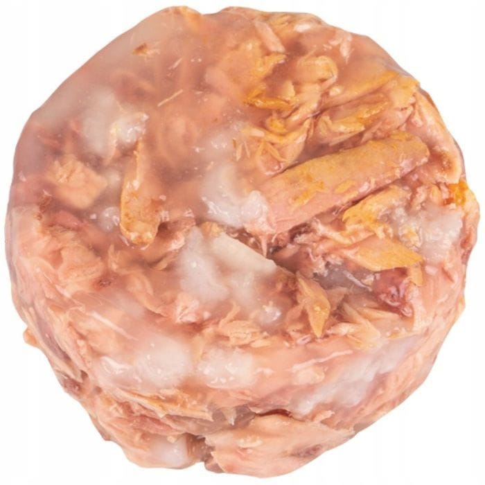Skład: tuńczyk 51%, krewetki 6%, ryż 1,5%, żelatyna roślinna 0,75%.