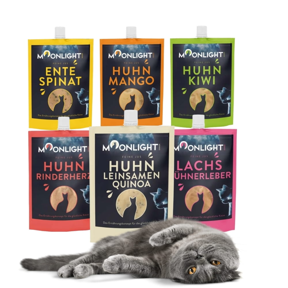 Moonlight Sos Łosoś z Wątróbką Drob. 60g + Kurczak z Siem. lnianym 60g + Kurczak z Sercami Woł. 60g + Kurczak z Mango 60g + Kurczak z Kiwi 60g + Kaczka ze Szpinakiem 60g