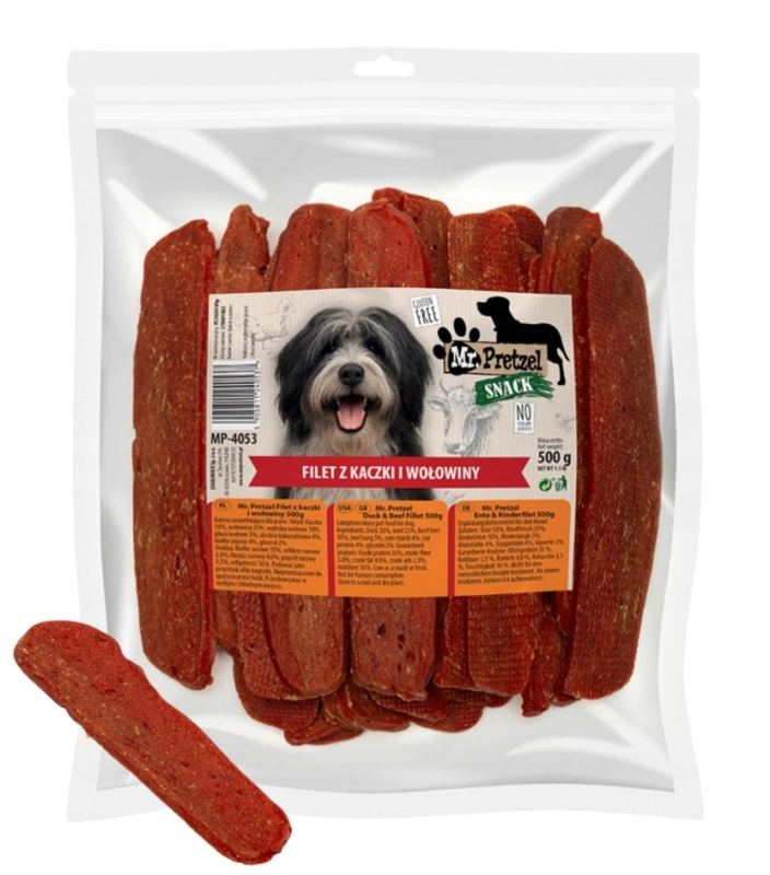 Mr. Pretzel Miękkie filety z kaczką i wołowiną to smakowite, mięsne przysmaki dla psa, stworzone z myślą o codziennym nagradzaniu, treningu i wspólnych chwilach radości.