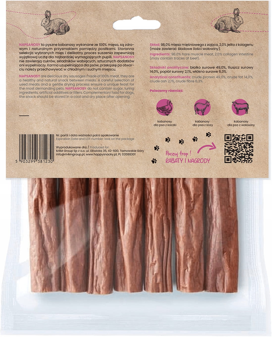 98% mięsa mięśniowego z zająca, 2% jelito z kolagenu
