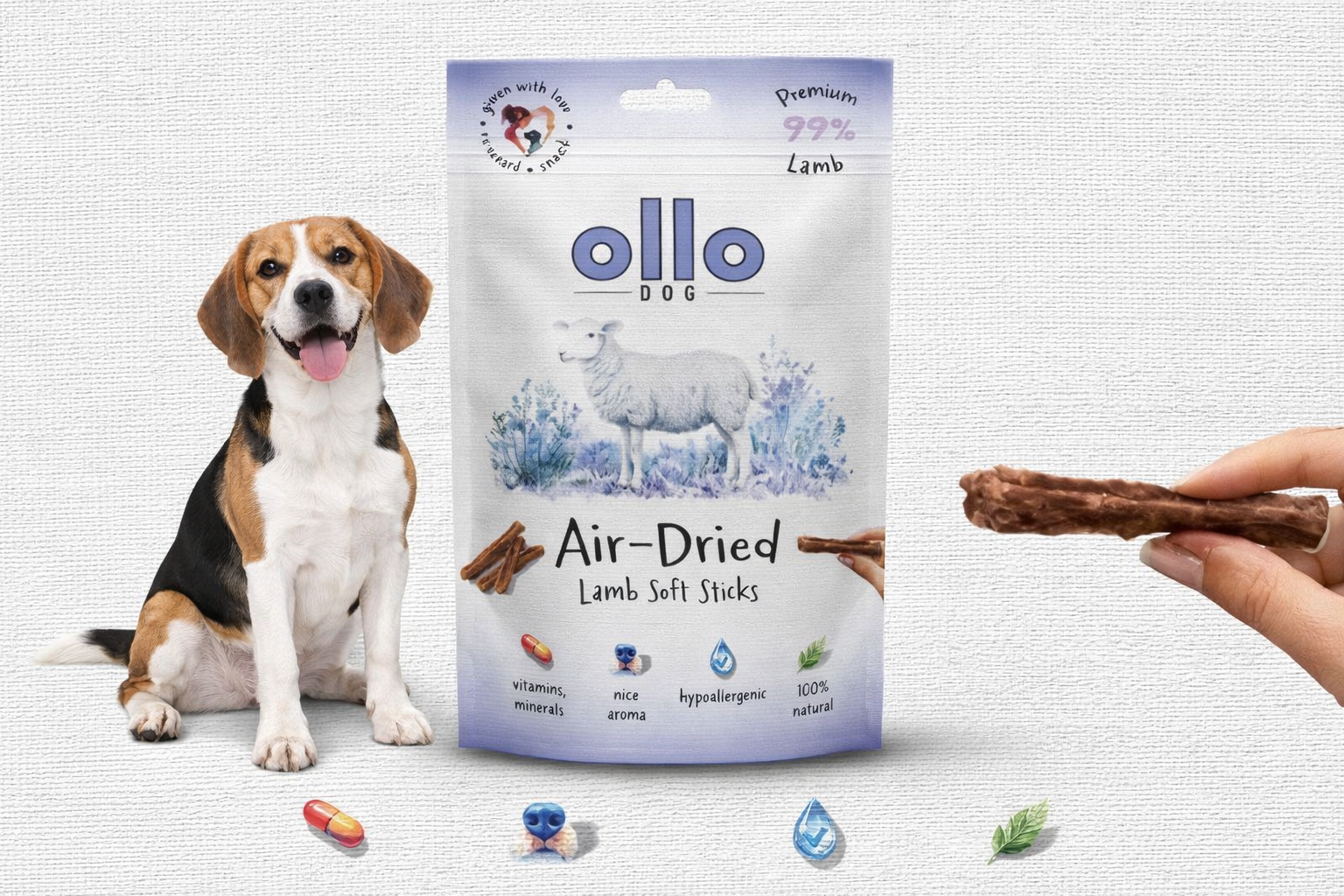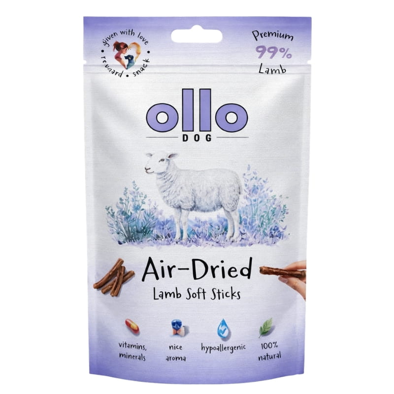 Naturalne, miękkie przysmaki dla psa stworzone z aż 99% jagnięciny. Ollo Air-Dried Lamb Soft Sticks to monobiałkowe, hipoalergiczne pałeczki idealne dla psów z alergiami oraz wrażliwym układem pokarmowym.