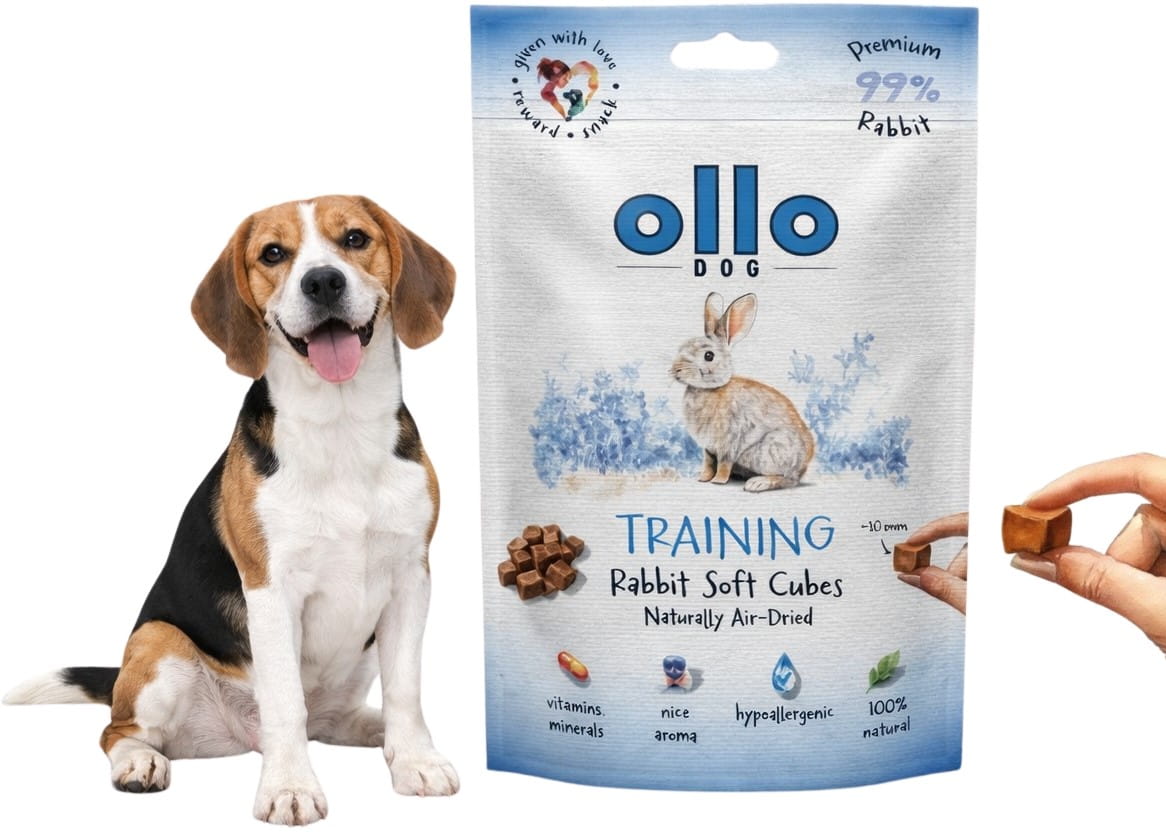 Naturalne, miękkie przysmaki treningowe dla psa stworzone z aż 99% królika. Ollo Air-Dried Rabbit Soft Cubes to monobiałkowe, hipoalergiczne kosteczki idealne do nagradzania podczas treningu, spacerów i codziennej motywacji.