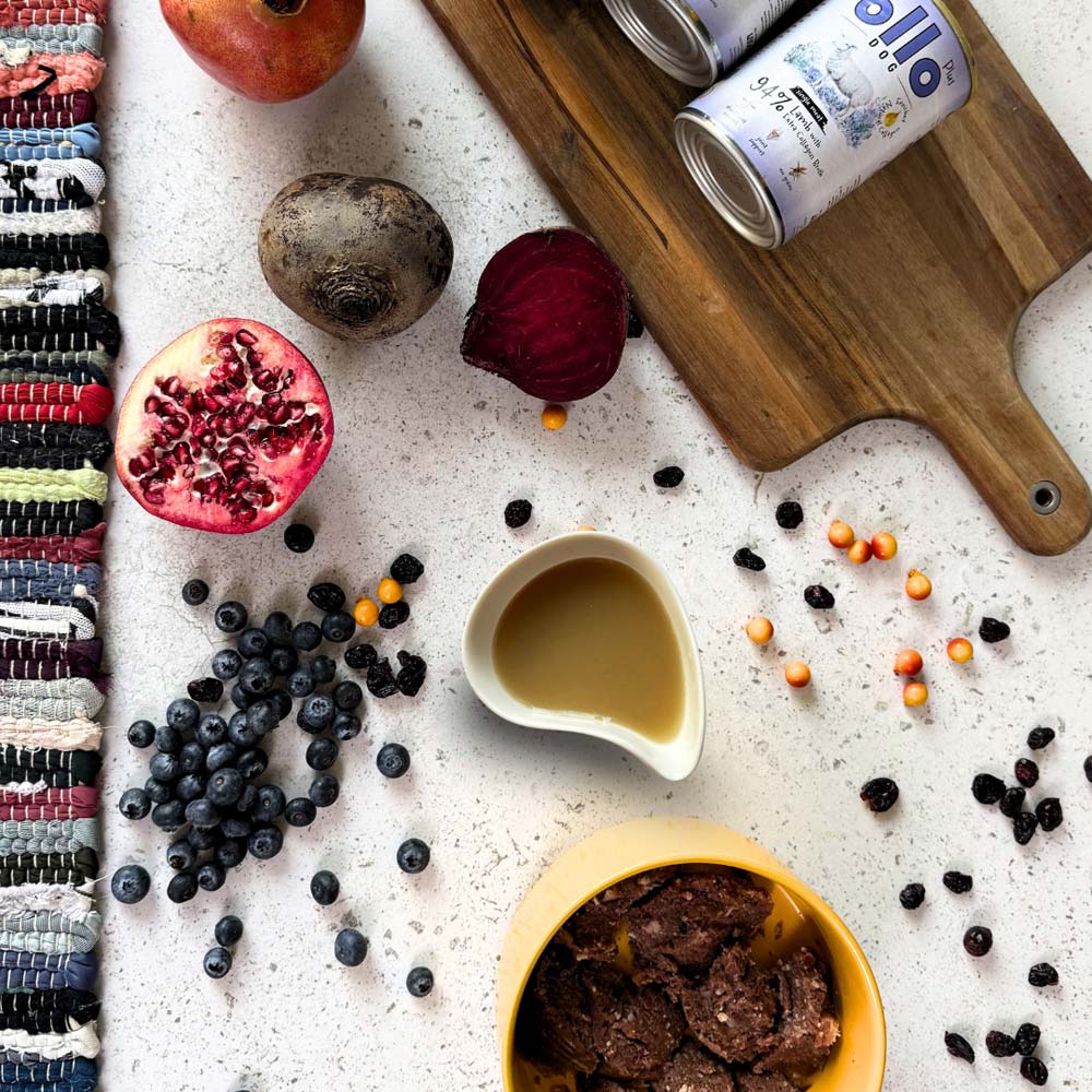 Jagnięcina 70% (mięso mięśniowe 40%, płuca 18%, wątroba 12%), bulion kolagenowy 24%, witaminy i minerały 3%, MSM 1%, dzika róża suszona 0,5%, ekstrakty roślinne 0,25% (granat, borówka, acerola, burak), żurawina suszona 0,25%, ekstrakt z Boswellia Serrata 0,2%, drożdże piwne 0,2%, inulina 0,1%.
