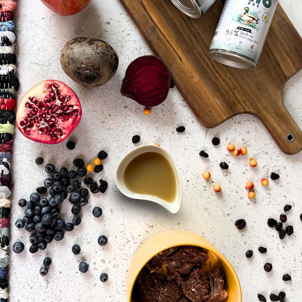 Kaczka 70% (mięso mięśniowe 40%, wątroba 8%, serca 10%, żołądki 12%), bulion kolagenowy 24%, witaminy i minerały 3%, MSM 1%, dzika róża suszona 0,5%, ekstrakty roślinne 0,25% (granat, borówka, acerola, burak), żurawina suszona 0,25%, ekstrakt z Boswellia Serrata 0,2%, drożdże piwne 0,2%, inulina 0,1%.