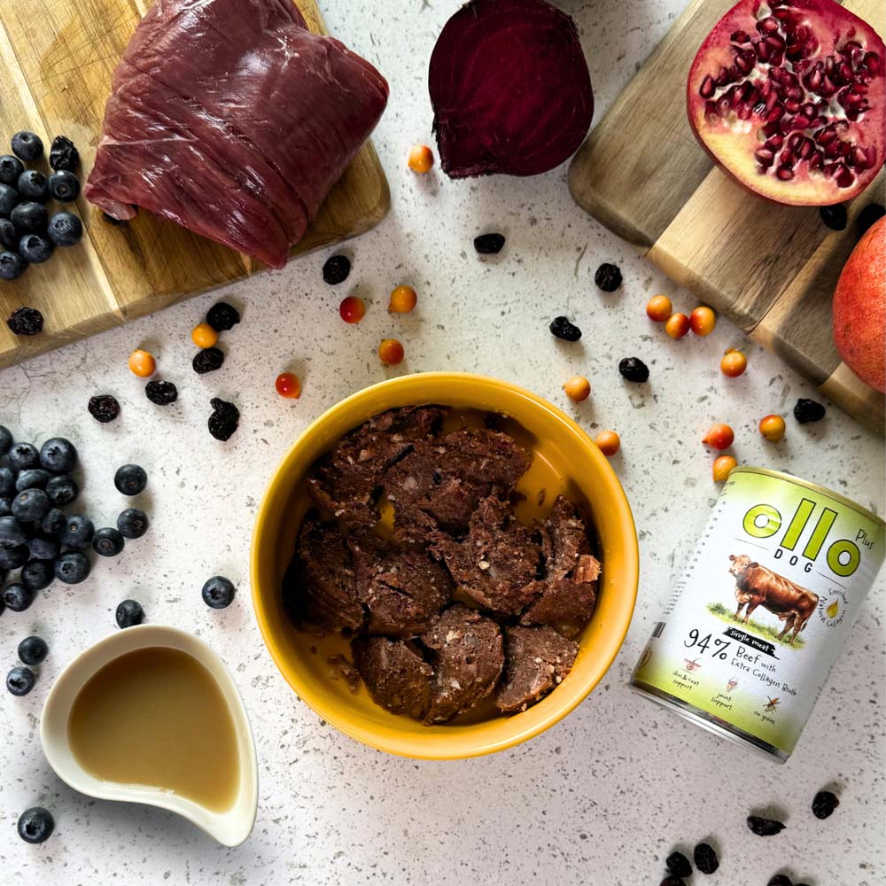Karma zawiera aż 94% wołowiny z naturalnym kolagenem oraz tylko 1% warzyw i owoców. Dzięki temu dostarcza wartościowego białka oraz składników wspierających zdrowie, mobilność i regenerację psa.