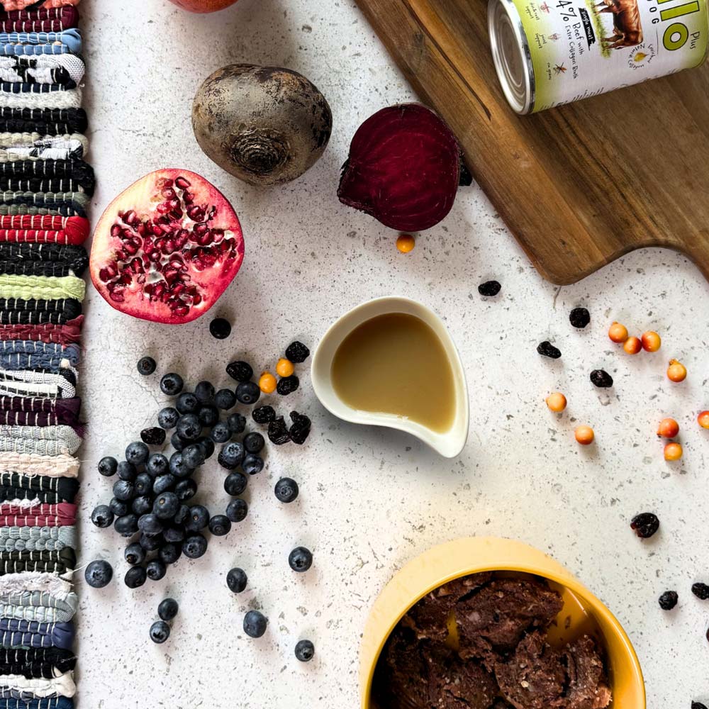 Wołowina 70% (mięso mięśniowe 40%, żwacze 30%), bulion kolagenowy 24%, witaminy i minerały 3%, MSM 1%, dzika róża suszona 0,5%, ekstrakty roślinne 0,25% (granat, borówka, acerola, burak), żurawina suszona 0,25%, ekstrakt z Boswellia Serrata 0,2%, drożdże piwne 0,2%, inulina 0,1%.