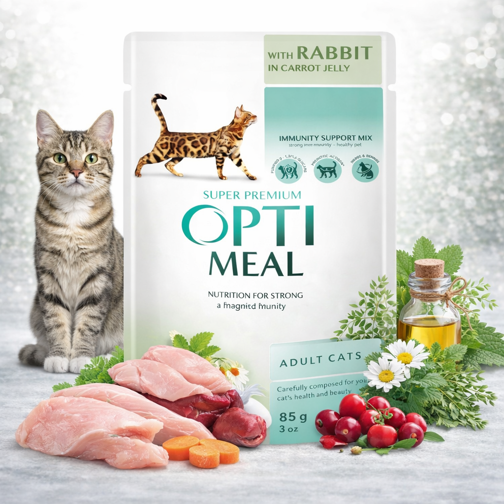 Karma zawiera mięso królika oraz wysoką zawartość składników pochodzenia zwierzęcego, które dostarczają łatwo przyswajalnego białka. Dodatek marchewki wzbogaca dietę o naturalny błonnik i witaminy, a specjalny kompleks Immunity Support Mix wspiera naturalną odporność organizmu kota.
