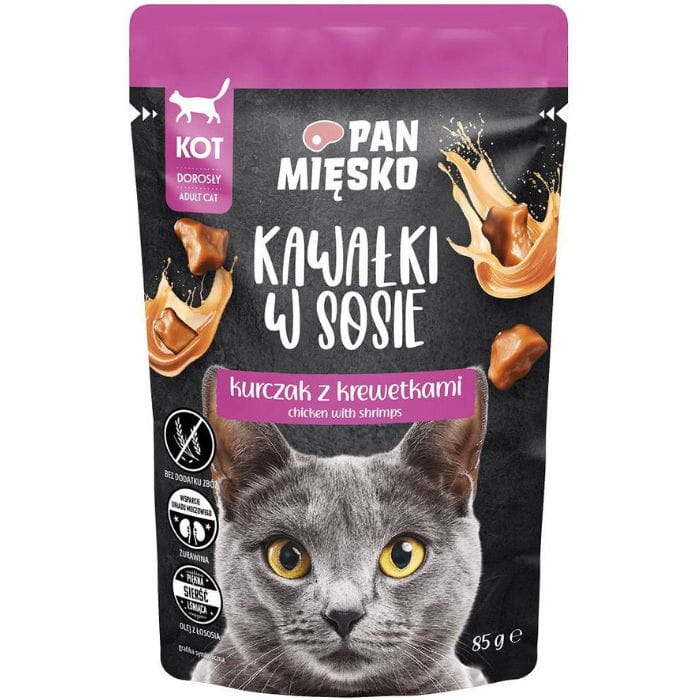 Pan Mięsko Karma mokra dla kota Kawałki w sosie Kurczak z krewetkami 12x85g