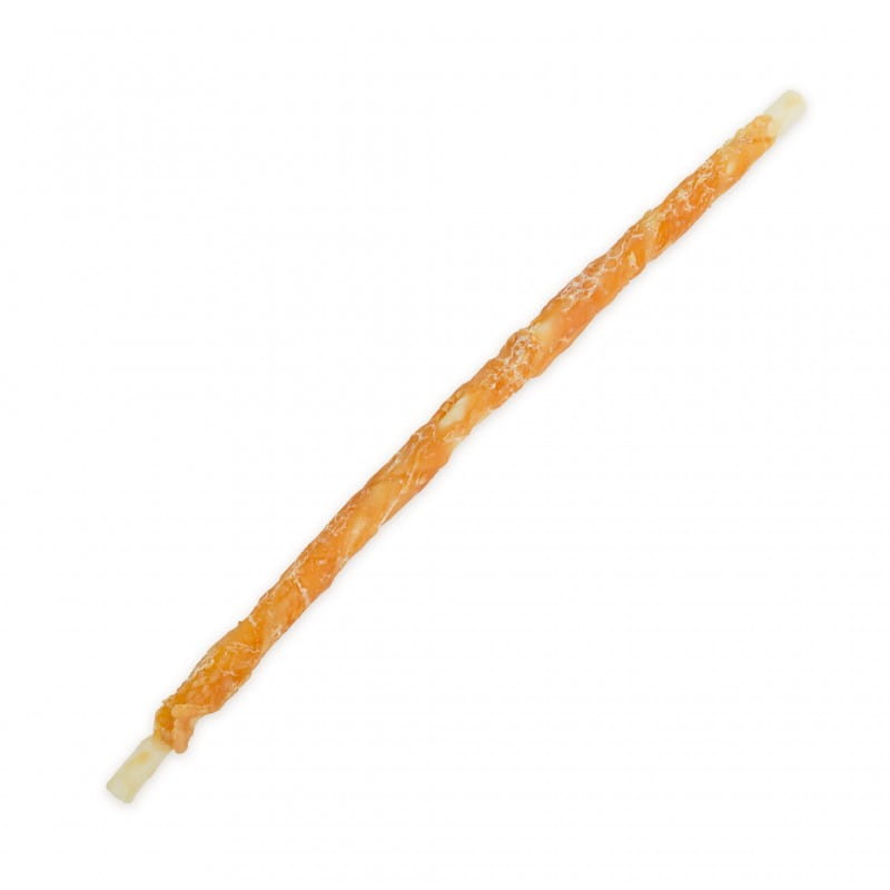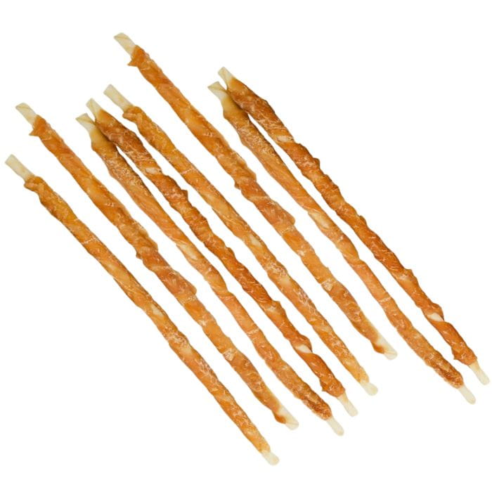 Długie patyki z suszonej skóry wołowej, owinięte mięsem kurczaka