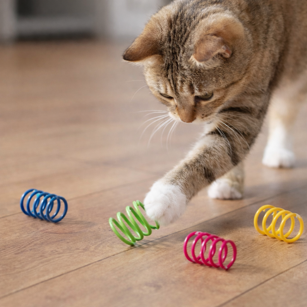 Zestaw kolorowych sprężynek dla kota, które zachęcają do aktywnej zabawy i pobudzają naturalny instynkt łowiecki.