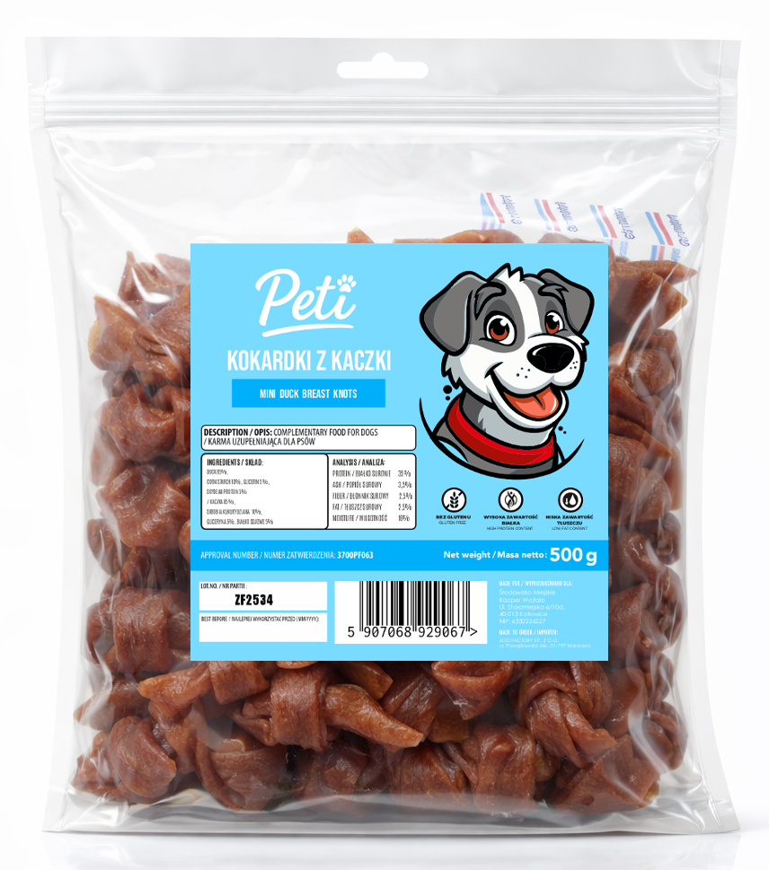 Skład: kaczka (85%), skrobia kukurydziana (5%), gliceryna (5%), białko sojowe (5%)