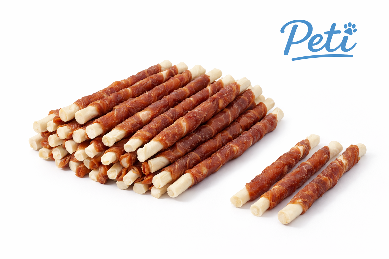 Twarde pałeczki owinięte warstwą mięsa doskonale zaspokajają naturalną potrzebę żucia, zapewniając psu długotrwałe zajęcie i mnóstwo przyjemności.