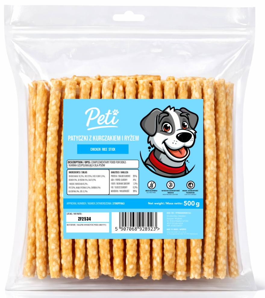 Patyczki z kurczakiem i ryżem to smakowity i aromatyczny przysmak dla psa, idealny jako smakołyk treningowy, nagroda po spacerze lub codzienna przekąska.