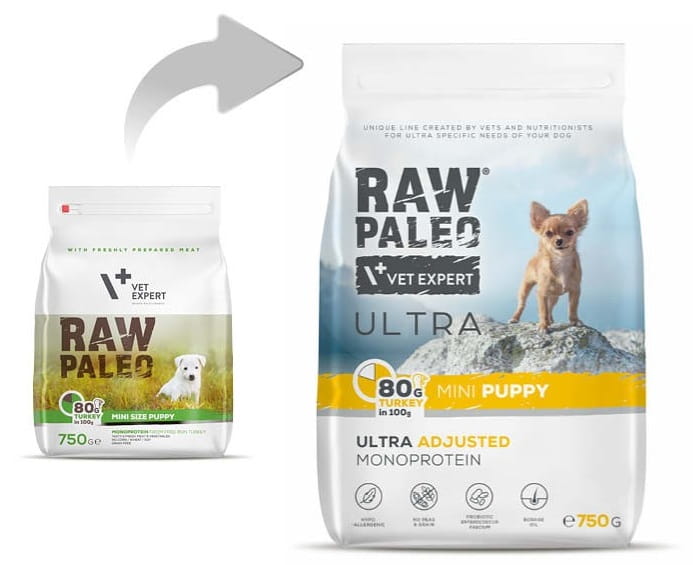 Raw Paleo Ultra Mini Puppy Turkey to specjalistyczna, wysokomięsna karma dla szczeniąt ras małych, która wspiera zdrowy rozwój, prawidłowe trawienie i piękną sierść już od pierwszych miesięcy życia.