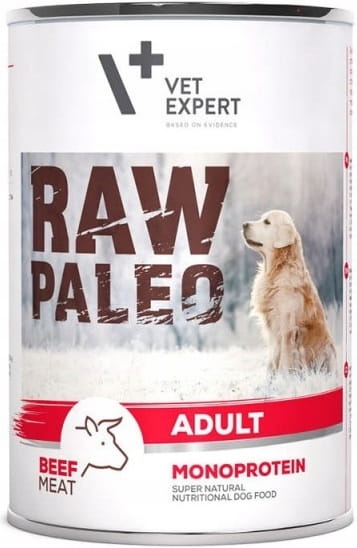 Karma mokra RAW PALEO dla psów dorosłych jest kompletną i zbilansowaną pełnoporcjową karmą bytową przeznaczoną dla psów od ukończenia 1. roku życia